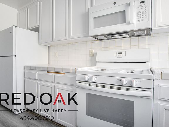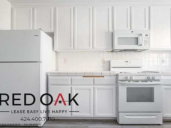 Bright windowsEssential kitchen appliancesTile countertopsHardwood cabinetsAmple closet spaceVertical blinds