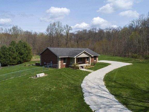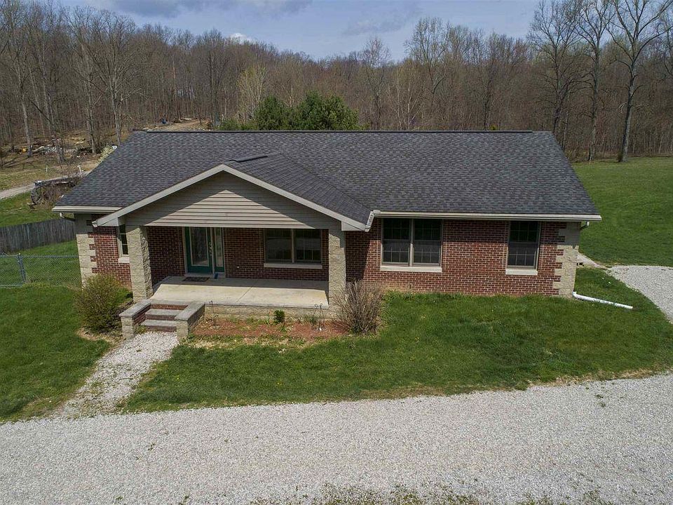 All brick ranch home with 3 bedrooms, 3 baths, open floor plan, full partially finished basement with huge recreation room all on 5 acres. Surrounded by woods along the back and fencing, you'll enjoy a large patio for those summertime bar-b-cue's. The family room, dining/breakfast area, and kitchen are all open with cabinets aplenty, a large breakfast bar, and wood floors. The bedrooms are spacious and comfy and the master bedroom offers an en suite bath with nice walk-in shower. A large laundry room is conveniently located on the main level as well. The entrance to the home offers a nice covered front porch and the limestone keystones in the brick on the corners give this home a lot of appeal. The basement has plenty of room to finish out another bedroom and there is a bath and safe room there as well. The open span area has high ceilings and a walk-out to the back patio. This is a well built, solid home with so much to like. It's hard to find that 5 acre lot in the country and if you like to have some land to play on, you'll find it here!