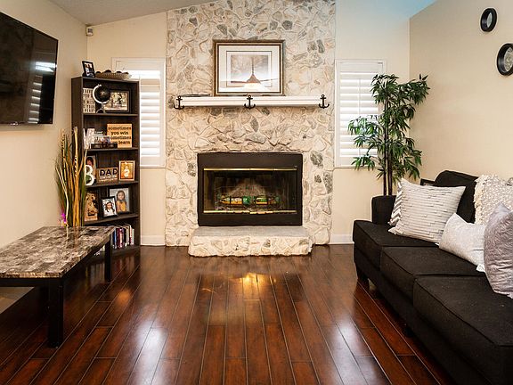 Imagine coming home from a long day of work, walking into your home that offer's numerous conveniences. As you walk in the front hallway place your keys onto the recessed wall shelf and continue walking to the bar where you serve yourself a refreshing beverage. When it's hot outside you can stroll into the back yard and take a dip in your beautiful in ground pool. When it's chilly outside, you can light a fire in your living room fireplace and enjoy the ambiance. Marvel at the beauty of your home that offers newer stainless steel appliances, upgraded fixtures throughout the home and cultured stone countertops. Plantation style shutters are convenient and provide a beautiful touch. This 3 bedroom 2 bathroom home provides comfort and convenience that will accommodate all family