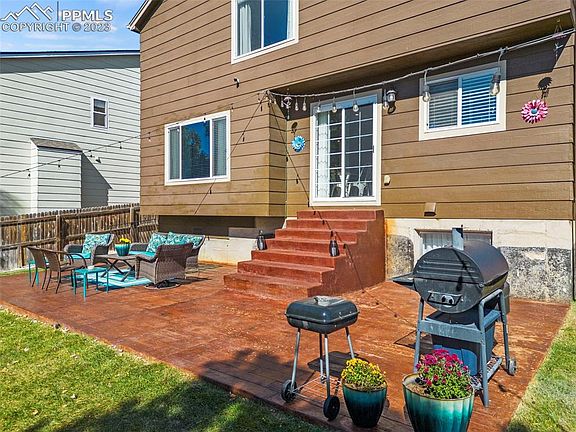 Quick Possession Possible! This beautiful home exudes an air of tranquility and warmth! This two-story home is located in a quiet neighborhood and is perfect for anyone looking for a turnkey property. This home is an easy walk to the schools, shopping and medical facilities and Peterson Air Force Base. This beautiful home has lots of features and upgrades that make it stand out. 1. The kitchen has a 5-burner gas stove for that inspiring new chef in the family. 2. 100% Laminate wood flooring throughout main and upper level with new carpet on stairs. 3. A poured stamped & stained concrete patio that measures 16x34 feet for entertaining or for enjoying a more intimate moment with your loved ones. 4. Backyard landscaped, added new sprinkler system, trees and rock perimeter with a second gate for easy access and a concrete pathway leading to the driveway 5. Refaced fireplace with stone brick for a warm and modern look and, added new mantel and shiplap to the wall for a complete professional look and feel. 6. Multiple rooms have recessed lighting 7. The master bath is newly renovated with a custom glass shower, heated floors, and a bathroom exhaust fan with a Bluetooth speaker built-in 8. This house also has a radon mitigation system already installed. 9. The laundry and guest bath are shared and upgraded with a shiplap wall for an added touch to make it feel cozier and inviting. Extras: There are barn style doors added to kitchen pantry, master bath and the office. The space currently used as the office was originally designed for a nursery when the home was built. The owners, brilliantly use the living room space as a separate formal dining area. New metal handrails just installed to stairs on patio. The exterior of the home is a lovely shade of brown with a two-car garage and a well-manicured lawn. The home is move-in ready and is sure to impress. Welcome Home!