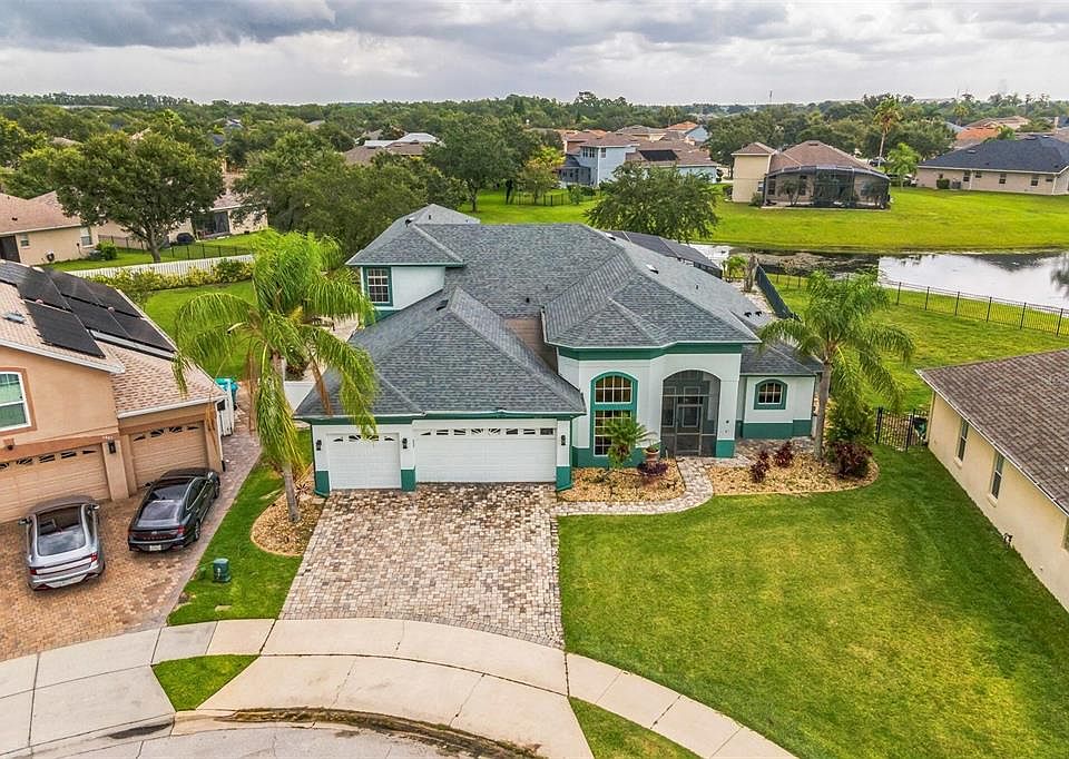 Your dream home awaits in the gated community of Vista Lakes! This stunning 5-bedroom (plus an office and a bonus room), 4-bathroom pool home is a captivating masterpiece that combines elegance, functionality, and a touch of tranquility. Spanning an impressive 3,457 square feet, this residence boasts an open layout adorned with high ceilings, abundant windows, and a remarkable 3-way split floor plan, offering both privacy and spaciousness. As you step inside, you'll be greeted by an open living room that looks out to the sparkling pool and pond. A stylish office awaits, providing a dedicated space for work or study. The primary bedroom is a true sanctuary, offering direct access to the pool area and showcasing a generously-sized walk-in closet, dual vanities, and a luxurious soaking tub—an ideal space for relaxation and rejuvenation. The large kitchen is a chef's delight, seamlessly connecting to the family room while overlooking the sparkling pool and picturesque pond. Whether you're entertaining guests or enjoying a quiet family dinner, this open-concept design ensures seamless interaction and effortless flow. Downstairs, you'll discover three additional bedrooms, each thoughtfully designed to provide comfort and serenity. Upstairs is an inviting loft area featuring a spacious bedroom and bathroom, perfect for guests or as a private retreat. Situated on an oversized lot, this exceptional property is nestled in a peaceful cul-de-sac, enhancing privacy and creating a sense of exclusivity. With an enchanting pond frontage, you'll enjoy relaxing views and the gentle sounds of nature. This home has remarkable potential waiting to be realized, allowing you to create the perfect haven that suits your unique tastes and preferences. Beyond the confines of your new home, the Vista Lakes community offers an array of amenities to enhance your lifestyle. Meandering walking paths along serene ponds, provide the perfect backdrop for leisurely strolls and moments of reflection. A delightful playground and park along the shimmering shores invite you to embrace the outdoors and create lasting memories. Convenience is key, and this home delivers just that. With easy access to a plethora of shops and restaurants, you'll have everything you need within reach. Plus, the proximity to Orlando International Airport ensures stress-free travel and seamless connections to your favorite destinations. Don't miss your opportunity to make this remarkable residence yours. Schedule a showing today and prepare to fall in love with your new home in Vista Lakes.