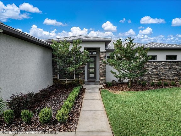 Built in 2022 by a premier luxury home builder, this custom-designed 3-bedroom, 2-bath residence in Sun 'N Lake of Sebring offers elevated living with high-end finishes and thoughtful upgrades throughout. Maintained in immaculate condition, the home showcases a standing metal roof, stone accents, soffit lighting, and exceptional curb appeal. Inside, luxury vinyl plank flooring flows seamlessly through the open-concept layout. The gourmet kitchen features granite countertops, shaker cabinetry, stainless steel appliances, and a designer tile backsplash. Tray ceilings and a built-in electric fireplace enhance the spacious living room. The formal dining room includes a decorative accent wall and can easily convert to a 4th bedroom or home office. The primary suite offers patio access and a spa-style bath with Jacuzzi tub, walk-in shower, and a California-style closet. Enjoy outdoor living on the screened lanai and in the fully fenced backyard—perfect for pets, play, or privacy. Additional upgrades include a whole-home water softener system for enhanced comfort and efficiency. Located in a vibrant resort-style community with two championship golf courses, clubhouse dining, tennis/pickleball courts, pool, and 24-hour security. This is a rare opportunity to own a truly custom home in pristine, move-in-ready condition in one of Sebring’s most desirable neighborhoods.