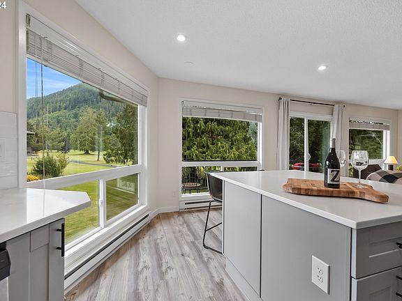 The best condo value on the market - a must see. Exceptional opportunity on this one level two bedroom two bathroom property. Open floor plan. Primary bedroom has private bathroom. Abundant windows for natural light. Located on the golf course and resort grounds with wonderful views of the golf course, mountains and valley. Remodeled and turnkey fully furnished and equipped for your immediate use or vacation rental. Wonderful kitchen and bathrooms, quartz solid surfaces, tile showers. Washer/dryer in unit. Air conditioning. Fireplace. Covered parking, separate storage closet. This community has a large private club house room with kitchen, BBQ and separate exercise room with equipment. This location is a short commute to Portland but offers all the amenities of mountain living: golf, hiking, skiing, fishing. See the virtual tour.