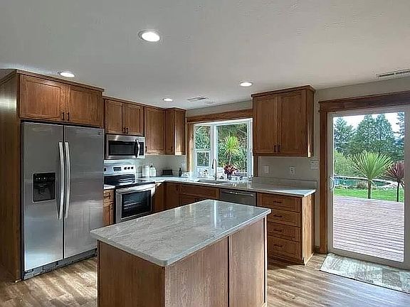 Privacy awaits once you start down your own private paved driveway to reach this beautifully remodeled home. The home is situated on 5.4 acres with total privacy, park like setting, and fantastic Southern exposure. Bring your horse, there is plenty of flat ground for a stable or arena. The home consists of 1684 sqft. with 3 bedrooms, 2 bathrooms, office, utility room, and two car attached garage. Many updates have been done to the home including: complete kitchen remodel with custom built Brown Hickory cabinets, quartzite countertops, and stainless steel appliances, vinyl windows, laminate vinyl plank flooring throughout, heat pump system and all ducting, interior and exterior paint, master bath remodel with jetted tub, 66 gallon heat pump water heater, and custom milled Myrtlewood trim. There's a large deck with hot tub overlooking the beautifully landscaped backyard featuring a spectacular pond with water feature and Koi. There is a chicken coop, greenhouse, & several fruit trees.