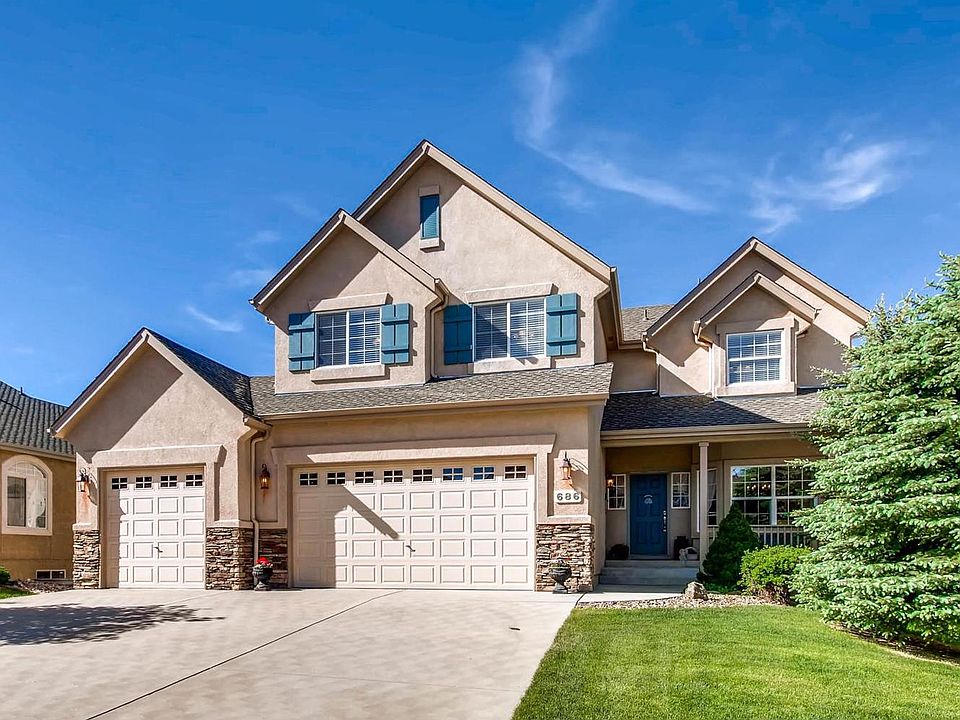 Welcome home to an immaculate masterpiece in like-new condition! This stucco beauty has beautiful and welcoming entry and features 4 large bedrooms and office/loft area on upper level (master features gas fireplace, built ins AND large reading/sitting area); main level boasts formal dining, large gourmet kitchen with corian counters and island with large pantry; bountiful eating area and great room with gas fireplace. The over-sized 3 car garage is fully finished. The views of the front range, Air Force Academy and Pikes Peak are truly breathtaking and to be enjoyed on the back deck with maintenance free decking and a retractable (electronic) awning - enjoy it all in the included (working) hot tub. The unfinished basement has high ceilings and plenty of room to grow if you need it! One of the finer communities within Jackson Creek - come take a look and you will see the difference.