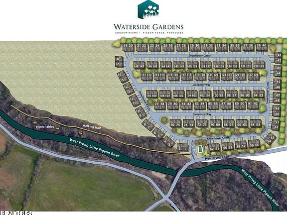 Welcome to Waterside Gardens Condominiums! Construction has begun on this two-bedroom, two-car garage perimeter unit with two spacious covered porches offering views of the 25-acre green space. Located in the heart of Pigeon Forge on 47 beautiful acres along the Little Pigeon River, and minutes from the wonders Dollywood, Gatlinburg and the Smoky Mountains, the brick and stone exterior of this new home means you can enjoy zero maintenance living from your covered front porch, covered side porch or back patio. Best of all, if you hurry, you get to customize all interiors from a wide selection of granite kitchen tops, soft-close cabinets, LVP flooring, and any paint color you choose. The condo also features a stone fireplace, living room and bedroom ceiling fans, stainless appliances, cathedral ceilings, elevated toilets and wide 36'' doors. Waterside Gardens will have a community pool, and walking trail and picnic tables for residents and their pets to enjoy. Waterside Gardens is being developed and constructed by the same team that built Riverbend Gardens and Creekside Gardens in Sevierville.