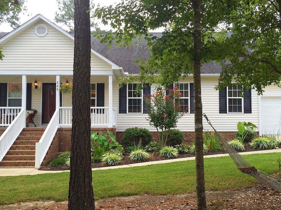 This single-level home feels like a retreat. Oak hardwoods are throughout the main living area in this open split-floor plan. The bedrooms are large with berber carpet. The kitchen is open to the living room with custom cabinets, a travertine-tiled backsplash, spacious countertops, and a bar for seating. There is plenty of closet storage in this home, his and her walk-in closets in the spacious master bedroom, and an oversized garage large enough to park two full-sized vehicles. The front porch has plenty of room for rocking chairs and the large back screened porch is wired with speakers to help you relax while enjoying the view of an exciting back yard that provides entertainment during all seasons. The backyard has a fire pit, paver patio, metal-framed pool with sundeck and walk-in stairs, large play set, and woods to build forts in while enjoying the privacy they provide.