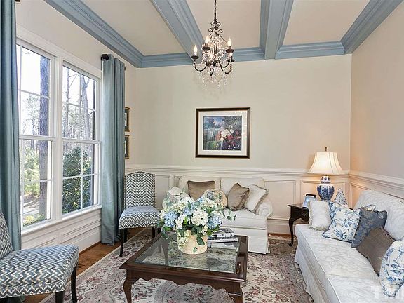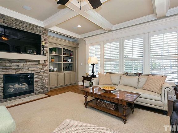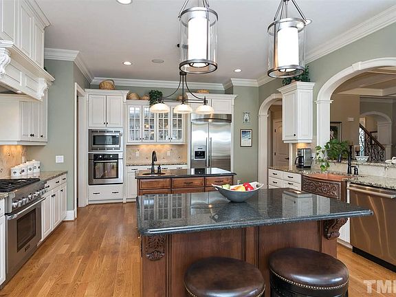Custom, sophisticated home on cul-de-sac in exclusive Estates of Copperleaf on .77 acres. Gourmet kitch w/dbl isles, huge pantry. Heavy trim work, built-ins & coffered ceilings thru-out. Massive mstr clst. 1st flr ensuite guest BR or 2nd office. 3rd flr xtra bonus/wrkout rm/BR w/bath. Multiple FPs. Fantastic screened porch w/ expansive stone patio & wonderfully landscaped fenced yd. Walk to new White Oak Elem School. Close to American Tobacco Trail & park. Located in hottest zip code in the Triangle!