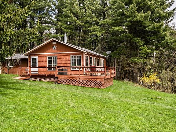 Yes! The gorgeous view is included with the seasonal cabin on 22 acres! Address is Jeff Campbell Ln but DO NOT drive up Jeff Campbell. Use Grandview Ln to property as the 'right of way'/driveway is off Grandview Ln. Owner contributes to funds to maintain Grandview Ln. This charming cabin comes furnished (with the exception of rocking chair & TV), with all new beds and living rm furniture purchased in 2013. New carpeting and kitchen/foyer flooring-2013. A 1/2 bath added in 2014. New lines were run from the septic tank to a new distributor box to new leech field-2015. New electric riser-2017. New water pump & holding tank-2011. H20 heater-2011. There is a washer/dryer hook-up. This cabin is 15 minutes to Hammondsport, finger lake trails, wineries & Keuka Lake close by for your enjoyment.