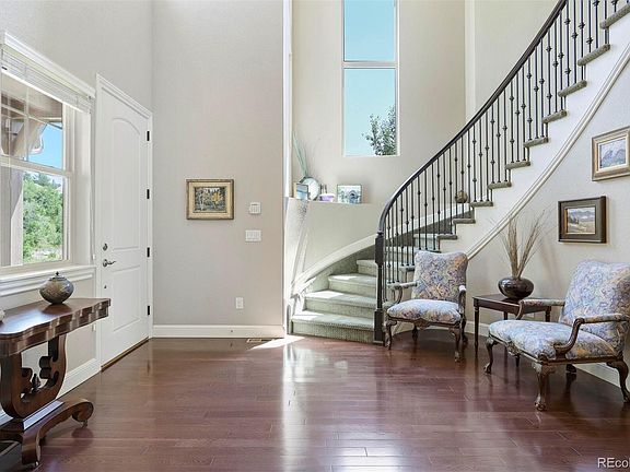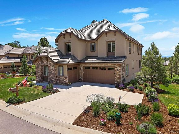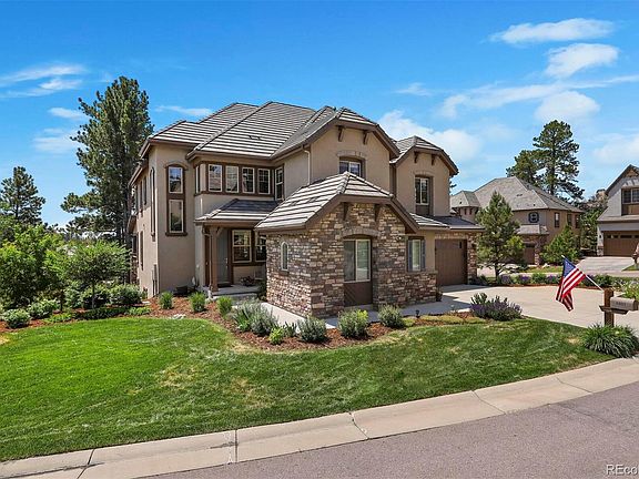 Stunning two-story in the Northstar neighborhood within The Village Castle Pines • Enjoy this updated and move-in ready home that sits amidst the Ponderosa pine • Built in 2015, finishes are updated throughout including the kitchen, appliances, flooring, bathrooms and lighting • A grand curved staircase, vaulted ceilings, and the coveted open floor plan create a versatile and contemporary lifestyle • Large windows capture the Colorado setting, mountain views and fill this home with light • Show stopping two-story great room features floor to ceiling stacked stone columns and fireplace • Sleek and contemporary kitchen includes stainless steel appliances, custom lighting and ample storage space including a walk-in pantry • Open concept dine-in kitchen with glass doors provides easy access for indoor/outdoor entertaining • Convenient butler's pantry joins the dining room to the kitchen and great room. • Nearby, a main floor bedroom suite is a versatile space for a home-office or gym, and includes an en suite full bath and closet • Atop the regal staircase you’ll find an open and spacious loft, ideal for a library, study or den • Primary suite is light-filled and open and boasts a custom walk-in closet and expansive 5-piece bath • Lustrous primary bath with deep soaking tub, large glass enclosed walk-in shower, and spacious vanity with dual sinks • Convenient upper level laundry with utility sink, storage, and counter space • Two additional private bedrooms, each with their own well-appointed and full bathrooms and sizable closets, round out the upper level • Unfinished lower level provides opportunity for future expansion • 3-car garage is oversized providing additional storage •