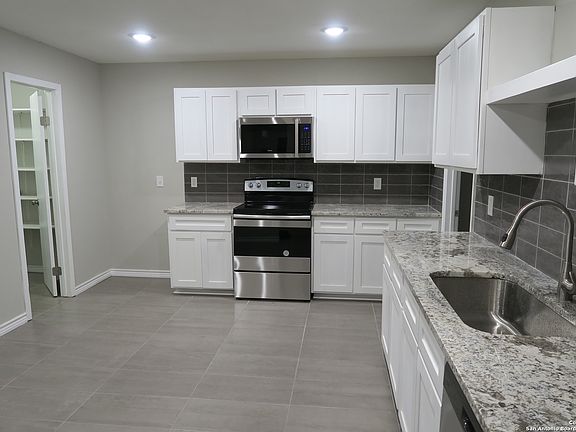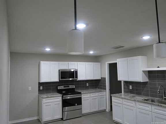 Amazing make-over on this one here...so much has been updated and replaced. All of the flooring has been upgraded, total paint inside & out, the kitchen was tore out to make room for the whole new renovation. These are not your typical "builder grade" cabinets; these are custom solid wood/ply cabinets built from scratch right here in San Antonio,Tx. They didnt get shipped in a box from overseas. The appliances were all replaced: new stove, microwave, garbage disposal, even the water heater. The HVAC system was replaced with a new AC unit outside and heater/coil inside. Granite on all the counter tops, new fixtures & fans, cool updated LED lights were added throughout the kitchen, livingroom, family room, and master bedroom. These lights really give the house a custom, modern feel. New garage door opener with the "MyQ" feature so it can connect to your phone to be opened or closed. THe list goes on and on....the roof was replaced (another very expensive update), the baseboards, different trim work, etc...***Good STORAGE--The master closet is big, the kitchen pantry is big, the 2ndary bedrooms even have walk in closets. There are 2 nice size closets in the back hallway as well. You will like all the closets in this house. **I am not finding alot of homes in this low price range that look like this**