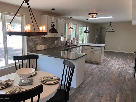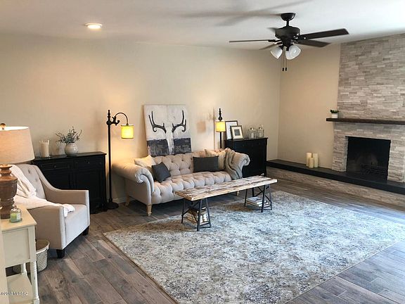 Breathtaking Mountain Views, inviting decorative paver entry, and meticulous desert landscape guide you into this tastefully Remodeled Home. Spacious open floor plan, gorgeous flooring, soothing palette, upgraded lighting, cozy brick fireplace w/hearth seating area, ceiling fans, and large arched front window. Stunning new kitchen features quartz counters, breakfast bar, glass subway tile backsplash, and white wood cabinets with hardware. 2 Sets of Arcadia doors to patio. Interior laundry room. New carpet/padding in all bedrooms, ample closets, 2 upscale baths with designer mirrors, tile, fixtures, and lighting. Fantastic backyard setting with covered patio, RV Gate, and incredible blue skies. Plenty of room for a pool & toys! Owner/Agent.
