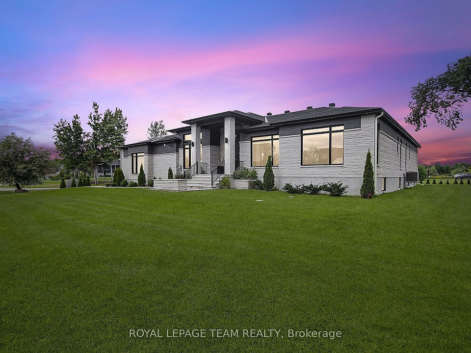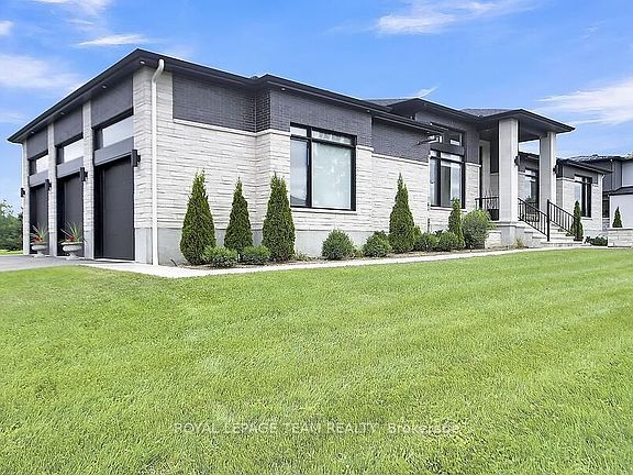 This expansive custom-built bungalow offers 6 bedrooms and 5 bathrooms, showcasing elegant wide plank oak hardwood flooring, oversized windows, and exquisite craftsmanship throughout. Designed with modern living in mind, the open-concept layout welcomes you through a stylish foyer into a grand living room that seamlessly extends to a covered veranda, complete with a cozy wood-burning fireplace. The chef-inspired kitchen is a true centrepiece, featuring a stunning waterfall quartz island with generous seating, quartz backsplash, gas cooktop, and a bright breakfast nook perfectly complemented by a separate formal dining room for more refined gatherings.The luxurious primary suite is a private retreat, boasting a spacious walk-in closet with custom vanity, a 5-piece ensuite with double sinks, a glass-enclosed shower, freestanding soaker tub, and a gas fireplace for added comfort. Three additional bedrooms are located on the main floor, two of which offer private en-suites. The fully finished lower level features heated floors throughout, three large bedrooms, a full bathroom, and a vast recreational space with endless potential for entertainment or relaxation. Additional highlights include a heated 3-car attached garage with soaring 20-ft ceilings and a fully integrated smart home system with wireless control and state-of-the-art 5-zone wireless speakers.