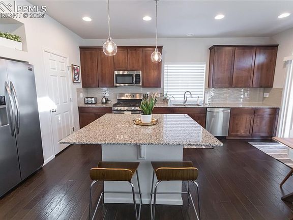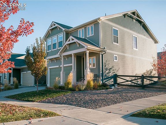 Don’t miss this beautiful 4-bedroom, 3.5-bath home located in the coveted Banning Lewis Ranch neighborhood! This two-story home with views of Pike’s Peak features a stylish open-concept living room and kitchen perfect for entertaining. The kitchen sports a giant island gas range, stainless steel appliances, and a spacious pantry. A convenient powder room is located on the first level as well! As you step up to the second story, you’ll find an expansive primary bedroom with a large walk-in closet and an adjoining 4-piece bathroom with a free-standing shower and double vanity. The second story also includes 2 more bedrooms, another bathroom with double vanity, 3 storage closets, a spacious laundry room, and a loft. This home maximized its square footage with the finished basement! In the basement, you’ll find the 4th bedroom, another full bathroom, a family room, and plenty of storage. There are upgrades galore including 9-foot ceilings, kitchen backsplash, granite counters, upgraded stair rails, stainless steel appliances, and much more! This home is located on a large corner lot right in the center of the neighborhood with a fully fenced yard that is accessible from the main level of the home with a large grass area and patio perfect for entertaining or relaxing. It is also just a short walk to Banning Lewis Ranch Academy! Through the HOA, this home comes with access to two heated community pools, a clubhouse with a 24-hour fitness room, tennis courts, pickleball courts, 50 acres of walking trails & parks, and schools all located just a short walk away. Easy access to Peterson SFB, US Air Force Academy, Schriever SFB, Fort Carson, Powers corridor, hospitals, shopping & entertainment!