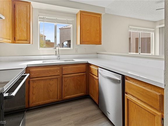 Brand new beautiful quartz countertops, state of the art stainless steel appliances & plenty of space for culinary creations in the gourmet chef's kitchen. Step into luxury living with this stunning remodeled Sunset Bay condominium where elegance meets ultimate comfort. The open-concept floor plan is bathed in warm natural light, showcasing brand-new luxury vinyl plank flooring, fresh paint, & a cozy wood-burning fireplace. Two spacious bedrooms feature brand-new plush carpeting, while the bathrooms have been elegantly upgraded with new vanities, modern plumbing fixtures, & new toilets. Each bedroom offers en-suite access to its own full bathroom. Unwind with a cup of coffee on your private covered patio, or indulge in the resort-style amenities including a sparkling pool, spa, and lush green spaces. Located just minutes from the Las Vegas Strip, the airport, UNLV, premier shopping, freeways, schools, & scenic parks. Enjoy convenience & sophistication all in one!