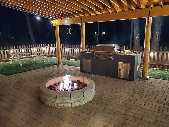 • Exterior Features: Gutters/Down Spouts, In the Trees, Landscaped, Street Paved, Tall Pines On Lot, Patio - Covered, Grill