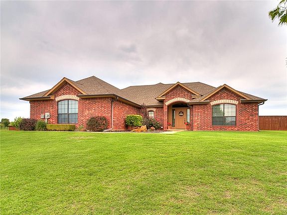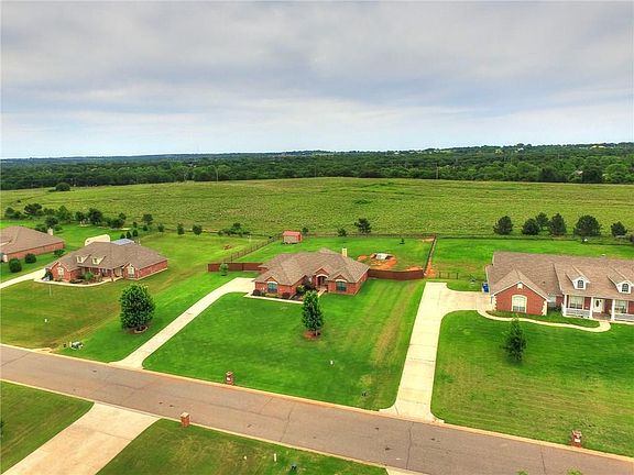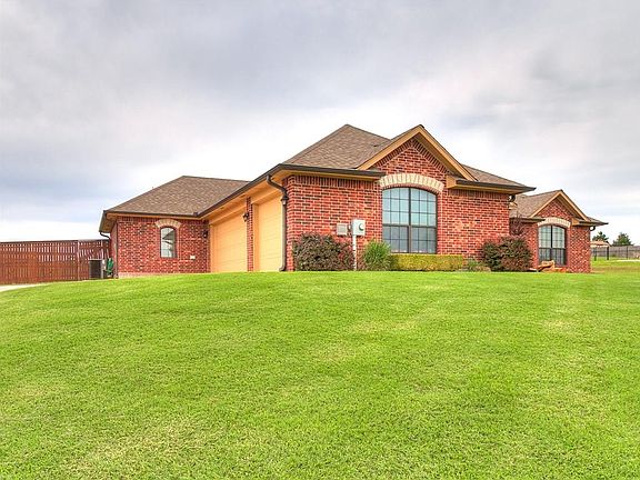 Rural setting just minutes SE of Guthrie and a short drive to I-35 make homes in Triple Crown Meadows highly sought after. Located in the back of the neighborhood, this beauty backs to a very large pasture owned by a church camp so odds of having neighbors behind you are slim. Pride of ownership is evident in this well-maintained home. Upon entering you are greeted by a spacious living/dining/kitchen flooded with natural light from multiple east-facing windows that look out onto the large covered patio and fenced backyard that offers a storm shelter and storage building. A large breakfast bar, granite counters and walk-in pantry with custom built-door mounted spice rack will please the cook in the family. Master bedroom sports a tray ceiling and bay windows. The ensuite bathroom has 2 separate vanities, linen, soaker tub and spacious walk-in closet. Laundry has room for Freezer and more! Even the west windows have been tinted! Beautifully landscaped too! See this one soon!