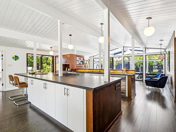 Fruit treesPost-and-beam constructionMid-century modern architectureExpansive backyardCustom kitchenSingle-level eichlerCustom swim spa