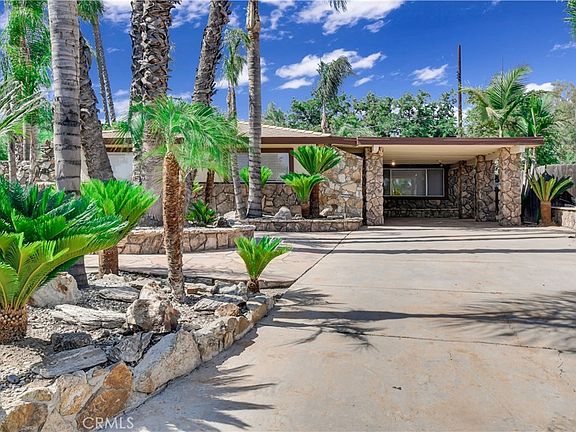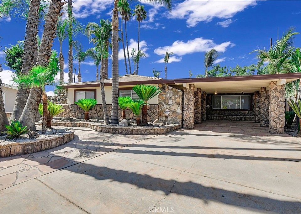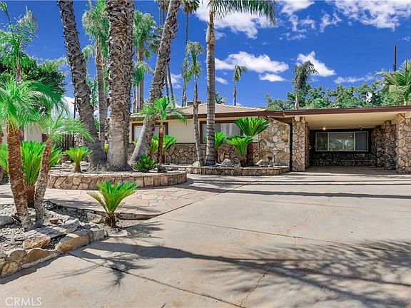 Come see this Stunning property in an exclusive community of Riverside! This unique, single-story property offers 3 bedrooms, 2 bathrooms, and an enormous 10,890 square foot lot. This home is an entertainers delight, and perfect for comfortable living. You will be captivated by the outdoor oasis in the backyard, inground pool and spa, waterfalls, bbq, and a wrap around covered patio, just in time for summer! As you come into the home, you'll immediately see the abundant natural light and open floor plan. Brand new luxury vinyl plank flooring flows seemlessly throughout the entire home. The entry flows into the family room and dining room, featuring sliding glass doors that flood the space with sunlight and a custom stone-framed bar area, perfect for hosting guests. The kitchen is complete with a custom rock wall dining nook, recessed lighting, and easy access to the backyard. It's equipped with laminate countertops, a free-standing range with a burner stove and oven, dishwasher, and ample cabinet space for all your storage needs. The spacious living room is a highlight of the home, featuring custom-built drop-down lighting and a larger rock-framed media niche with built-in cabinets and secret doors leading to a storage room. The large window brings in plenty of natural light, creating a warm and inviting ambiance. The hallway bathroom offers a shower/tub combo, tile floors, and a single sink vanity for your convenience. The master bedroom is a tranquil retreat with a custom rock and mirrored wall, a closet with mirrored sliding doors, a window, and a ceiling fan. The master bathroom features a walk-in tiled shower and a single sink vanity. The additional bedrooms are equally spacious and comfortable, boasting luxury vinyl plank flooring, windows, ceiling fans, and closets with mirrored sliding doors. Outside, the backyard is your own personal paradise. Enjoy entertaining under the full-length covered patio and relax in the beautiful custom in-ground pool and spa with large waterfall accents. The lush palm trees, flagstone, and landscaping create a serene environment, and a large storage shed offers practicality. Conveniently located near major highways, shopping centers, public transportation, and dining options, this home provides the perfect blend of privacy and accessibility.