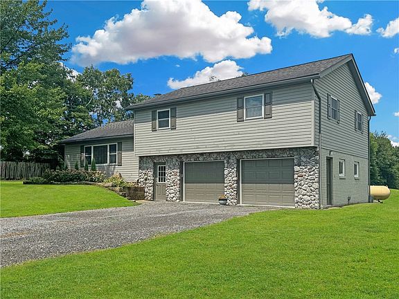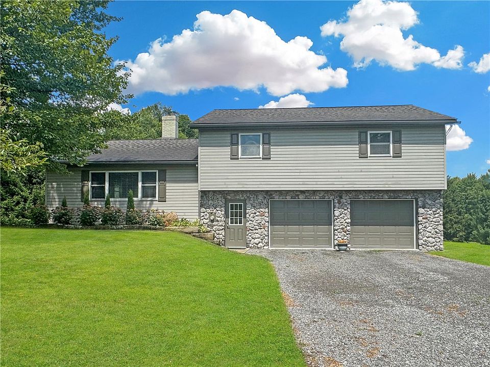 Discover amenity-rich country living in this undeniably fabulous multi-level. Ground level entry offers a welcoming and functional space accompanied by an enviable full bathroom encircled in resilient ceramic tile, convenient laundry room and ample closet space. Elegance abounds as handsome hardwood steps and flooring grace the expansive sundrenched living room bathed in natural light offering an inviting atmosphere. The enviable kitchen showcases walls of gray cabinetry and a sleek, modern aesthetic. Marble-look counters and stainless appliances add a touch of elegance and sophistication. Upstairs, rest and relaxation await in three large bedrooms. Adjacent bonus room can easily be converted into a walk-in closet or master bathroom. Completing the upstairs is a beautifully designed, spacious bathroom. This idyllic property features a finished basement, charming summer kitchen, chicken coop, storage barn, tranquil pond.