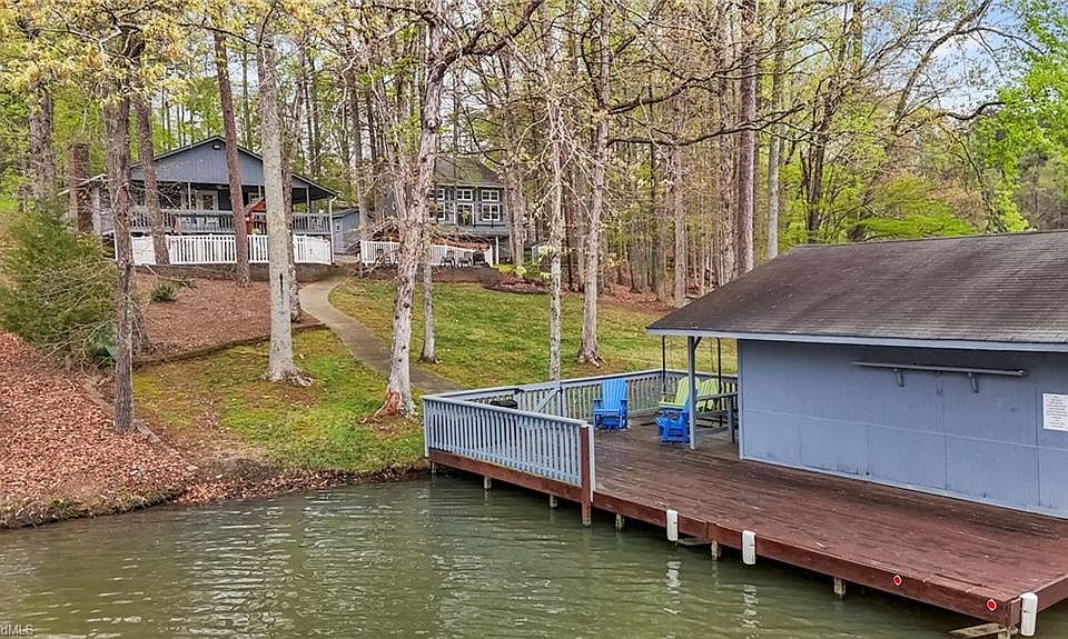 Charming cottage tucked away on a cove on the northern shore of Hyco Lake. Versatile floor plan functions well as one 4-bedroom home or can be used as two separate 2 bedroom units, each with their own entrance. Perfect for groups to have a relaxing get away together but with your own private space. .74 acre lot with approx 100' of shore line. Exterior features include: Wrap around covered porch with sweeping lake views; boat dock with double covered boat storage ; gently sloping yard between house and dock for easy access; play set; storage shed; firepit; gutter guards; Approx 8-9' water depth around dock. Interior features include: Wood burning fireplace (gas line is present); plantation shutters; two kitchens, two living spaces; two laundry areas with stack washer/dryers included; furniture in back half of house (closest to lake) conveys in sale - see private remarks. The perfect relaxing retreat, 45 minutes from Hillsborough and 1 hour from Burlington,Chapel Hill or Durham.