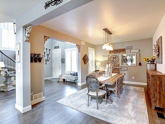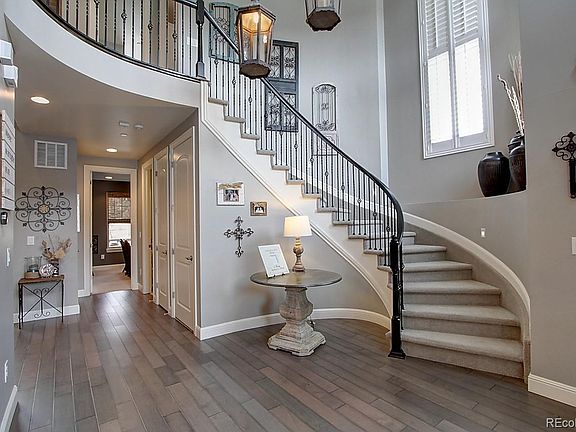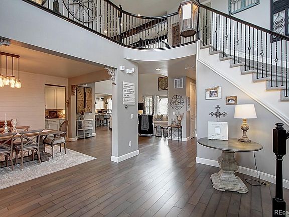 Welcome Home! Grand entry with curved staircase welcomes you to this impeccable, farmhouse-meets-chic home in prestigious Castle Pines! Open floor plan, soaring ceilings, hardwood floors, trowel paint, and high-end finishes throughout. Main level has formal Dining Room with Butler's Pantry leading to beautiful eat-in gourmet Kitchen. Kitchen features quartz countertops with decorative glass-tile backsplash, stainless-steel appliances, and large center island. Family Room boasts 2-story ceiling with wood beams, and gas fireplace with stunning stone surround. Casual dining area off the Kitchen opens to an expansive covered deck which overlooks patio w/ built-in fireplace--perfect for Colorado outdoor living! Master Bedroom features private 5-pc spa-like bathroom with custom barn door, free-standing soak tub, and dual shower heads. Located on cul-de-sac in gated community, private home with forest views, and plenty of trails and parks! Call now for your private tour!