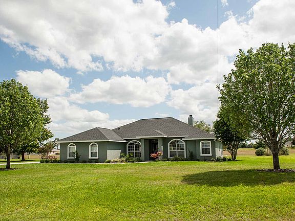 Golf Park home on over an acre, between Ocala and The Villages, in Belleview. Three bedroom plus office. Great floor plan with split bedrooms, eat in kitchen, formal dining, family room with fireplace and laundry/mud room with utility sink. Master bedroom features tray ceiling, two walk in closets and access to covered lanai. Master bath has dual vanities, shower and separate garden tub. Volume ceilings and wood burning fireplace in the spacious family room over looking the covered lanai. Side entry garage, irrigation well, updated faucets, freshly painted and a new roof in 2014. Oak, maple and pear trees compliment the landscape. Motivated sellers, transferred.