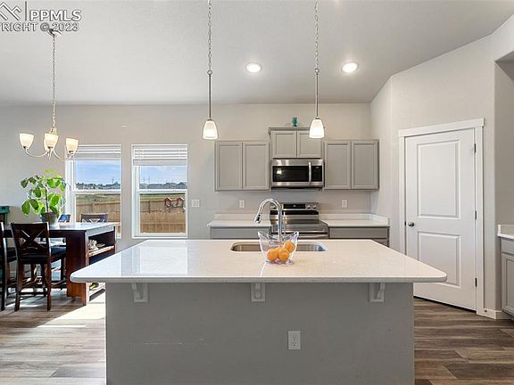 If you are looking for a better than new ranch style home with main level living, this 2021 built home may be the perfect fit for you! Step inside to discover luxury vinyl plank flooring throughout the entire home. Boasting vaulted celling’s, allowing for a luxurious open concept living experience. The kitchen is a true highlight, showcasing a plethora of storage in the modern style cabinets, electric range top, and a spacious quartz kitchen island with pendent lighting, it also includes a spacious pantry for added storage! The kitchen is open to the eat in dining area and flows right into the living room, perfect for entertaining. The sliding glass door gives you ease of access to your backyard to enjoy outdoor living, backing to open space. This grand open concept floorplan is ideal for both fun gatherings, and daily living. The larger primary bedroom is a retreat featuring space for a king size bed, vaulted ceiling with a ceiling fan, and attached bathroom. The primary bathroom features double vanity sinks, a walk-in shower with sizeable bench, quartz countertops, a walk-in closet, and a door on the powder room, offering both comfort and privacy. Your secondary bathroom is situated near the front of the home and features double vanity sinks, and quartz countertops. This exquisite single-level living ranch-style home with mountain views from your front porch will not last long!