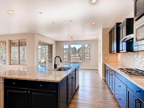 New home in Castle Pines Village ready for Immediate move-in! Beautiful Crested Butte floorplan. Two story home features an open two-story entry and foyer with curved wrought iron rail staircase opening to formal dining room and study. Kitchen has double oven, granite counterops, gas cooktop, a huge center island and walk in pantry. Upstairs you'll find a stunning master bedroom with crown molding, 5 piece bath and three additional bedrooms. Other features include a stone fireplace in the living room, covered deck and patio off the walkout basement. Home is on a cul-de-sac lot near open space.