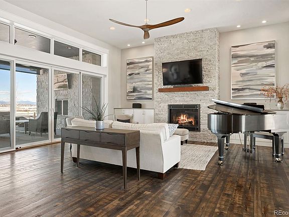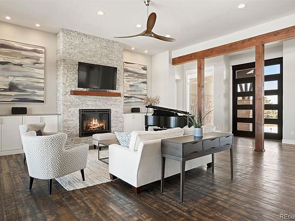 - Description: Open Floor Plan With Kitchen And Dining, Massive Front Range Views, Floor-To-Ceiling Stone Fireplace With Storage Cabinets, Hickory Hardwood Floors, Wood Beam Accents, Expansive Sliding Door To Patio.