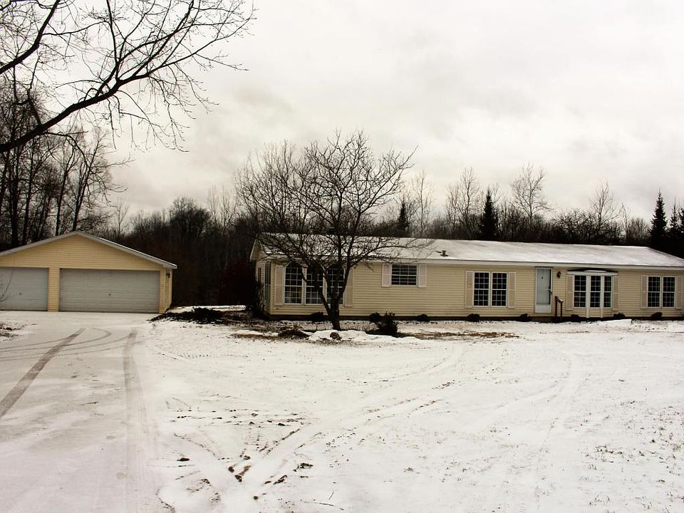 Beautifully updated manufactured home on 2 wooded acres. Nearly 1800 sq ft of living space plus a detached 3 stall garage complete with built in bench,openers and electric. The master suite has a private bath complete with dual vanity, whirlpool tub and separate shower. Large deck off the family room to your secluded and peaceful setting. New carpet,vinyl, paint and fixtures through out. Just move in!