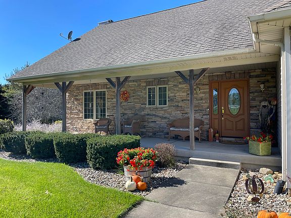 Inside, enjoy over 3,200 sq. ft. of open living space featuring cathedral ceilings, a stone fireplace, and expansive windows with breathtaking views. The kitchen, with modern appliances, flows into the dining and living areas. Highlights include a first-floor laundry, an open loft, and a master suite with a Jacuzzi and steam shower. The finished basement boasts a gas fireplace, movie room, bar, and rec room. Outside, relax on a two-level composite deck with a hot tub. Featuring a 3-car garage, a 24x30 pole barn, sprinkler system and generator ready wiring
