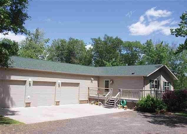 Beautiful 2000 sq ft home with 200 ft of sandy beach on Angus Lake. Living room and family room have see through fireplace, large kitchen with lots of cabinets, master bedroom suite with 3 walk in closets, full bath with garden tub and shower. 3 1/2 car attached garage, insulated, sheet rocked and heated. Nicely landscaped. The Tri-county trail is accessible just down the road for biking, hiking, four wheeling and/or snowmobiling and this property is adjacent to Bayfield County land! on the acreage across the road is a small barn and cleared area that use to have horses on it.