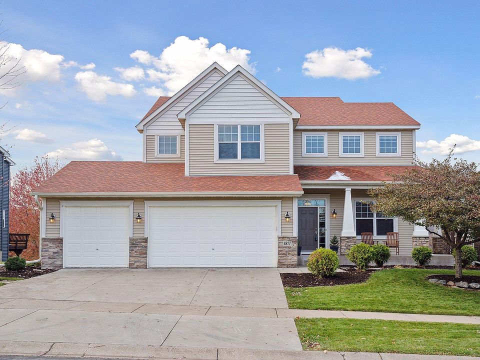 Total package! Host your holidays here! Bright, sharp, high ceilings, natural light and a spacious floor plan for entertaining. Open kitchen w/ enameled cabinets, soft-close hardware, butcher block island, Quartz, tiled backsplash, stainless appliances and updated lighting. Formal dining room could be used as main floor home office. Upstairs there are four large bedrooms + a HUGE bonus room. Primary suite w/ vaulted ceilings, separate tub and shower, newly tiled floor, Quartz, comfort height toilet, and huge walk-in closet. Gas fireplace w/ stone surround, 3-zone heating system, smart thermostat. Add'l smart home features: sprinkler sys., doorbell, main floor lighting, and GDO. New roof, siding, gutters in 2020, plus concrete driveway and wrap around, covered porch offer great curb appeal! Enjoy sunset view from the back deck. Finish walk-out LL to add space when needed. Popular ISD 279 schools, including MGHS. Owner related to Agent. One year home warranty included!