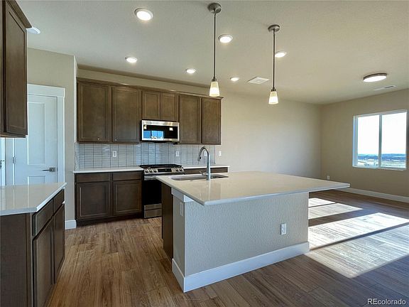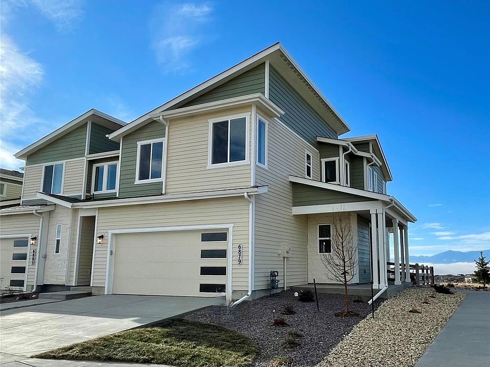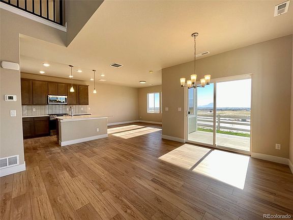 Discover the award-winning Alpine floor plan in the highly desirable Wolf Ranch community, where you can enjoy the beauty of mountain and lake views right from your covered patio. This community offers an array of amenities including a dog park, walking and biking trails, and Wolf Lake, perfect for fishing, kayaking, and paddleboarding. With easy access to D-20 schools, gyms, hospitals, I-25, and the Powers corridor, everything you need is within reach. This open-concept townhome offers 3 bedrooms, 2.5 baths, over 1,600 square feet of living space, and a 2-car attached garage. The spacious kitchen boasts upgraded cabinets and a large center island with seating, tile backsplash, a built-in pantry, stainless steel appliance package with a gas range, and quartz counters. The primary bedroom features a spacious walk-in closet and an en-suite bath with dual sinks, quartz counters, and a large shower with tile surround. Additional features include luxury vinyl plank flooring throughout the main level, open metal stair railing, and A/C to keep you cool in the summer. The private fenced and landscaped yard is maintained by the HOA, ensuring low maintenance living!