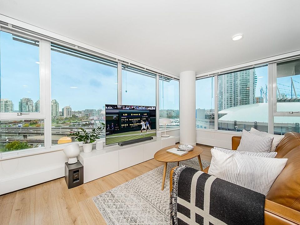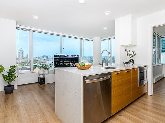 COMPLETELY RENOVATED WITH WATER VIEWS : Strategically located w/ every amenity imaginable is this 2 bdrm/2 bath/ Den jewel with 180 degree SE views of False Creek. Tastefully renovated from top to bottom w/ new kitchen that incl. cabinets, counters, appliances, light fixtures & lam flrs. Newly installed smart lock and nest thermostat. Your new bathrms inlc. rain showers, lighting & cabinetry. Desirable flrpln w/ bdrms on opposite sides w/ large in-suite storage & spacious den. Prime parking stall. Did we mention short term rentals allowed -- YES! Pet friendly, 2 Cats/ 2 Dogs allowed. Steps to Skytrain / Costco / T&T / Tinsletown Mall the list goes on.