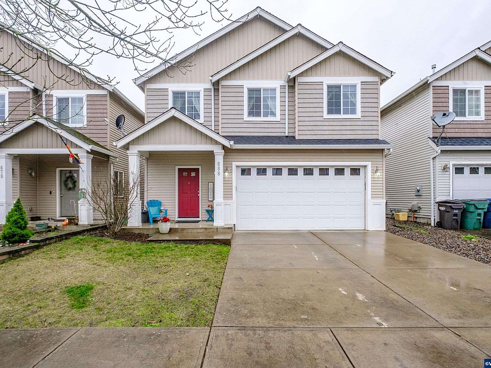 Stylish home w/open layout, laminate entry, high ceilings, gas fireplace. Kitchen w/tile countertops, LVP, French door Ref, walk-in pantry, updated stove, DW, dual basin sink/faucet, disposal. Other updates-water heater, LR fan/light, Google Nest TSTAT. Upstairs, a spacious primary w/large ensuite bathroom, dual vanity, two closets (incl. walk-in). Down the hall are a linen closet, versatile nook, laundry, 3 add. bedrooms, incl. one oversized. Backyard w/LRG patio, garden space, & shed. 1 mile from schools.