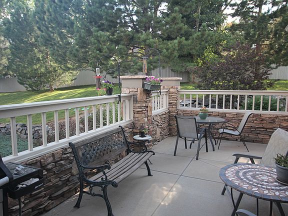 PRIME CASTLE PINES LOCATION. Sit on the wrap around patio and feel like you're in a park. This beautiful stucco two-bedroom ranch end unit townhome in Broadwick comes with an attached two car garage. It features a main floor master suite and a second main floor Master Bedroom with full baths and walk in closets. There is an additional loft area with bath. Hickory hardwood floors throughout the living room, dining room and master bedroom. There is a washer and dryer on main floor. The kitchen includes a portable stainless steel/wood island, stainless steel appliances (with convection oven), maple cabinets, slide out shelves, Corian counters and slate floors with area for a small eat-in table. The kitchen door leads to the private stone/gated patio. This wrap around patio faces south and west and has a landscaped area with grass and trees. Best location in complex. Full size unfinished open basement has ample areas for storage, exercise equipment, hobby area, etc. Includes access to the community club house, pool, tennis courts, basketball courts, pickle ball courts, playground, picnic area, and many walking trails. Douglas County Schools for this area are Buffalo Ridge Elementary, Rocky Heights Middle School and Rock Canyon High School. This is a Non-Smoking unit. Owner pays for trash and HOA fees