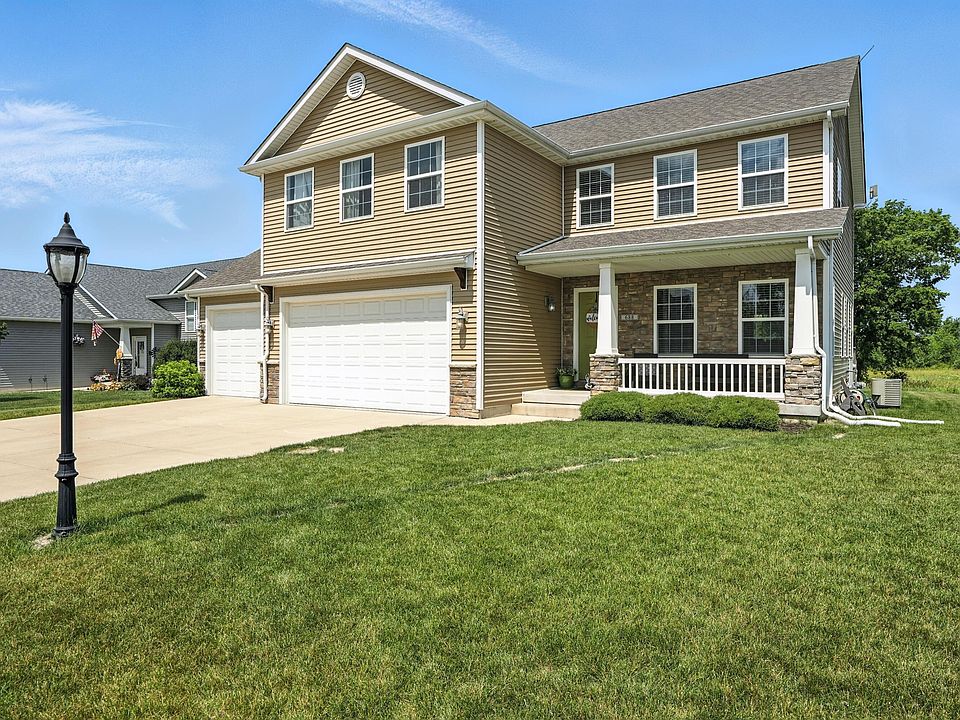 Welcome home to this adorable 4 bed, 2.5 bath 2 story on a full basement w/NO BACKYARD NEIGHBORS! Inside features an open concept living and dining area, just off the kitchen that has granite countertops, tons of cabinet space and black stainless appliances that stay! The main level den is perfect for and at home office or additional living space. The large primary upstairs features his/hers walk-in closets and a large en suite bathroom w/a luxurious soaker tub. All additional bedrooms have walk-in closets. Laundry is located upstairs for ease and convenience! The full daylight basement has a full bath roughed in and is ready to finish. The backyard deck overlooks the large, serene yard with nature as your backdrop.