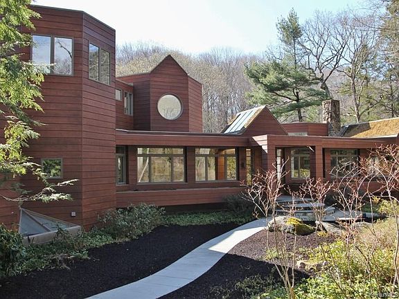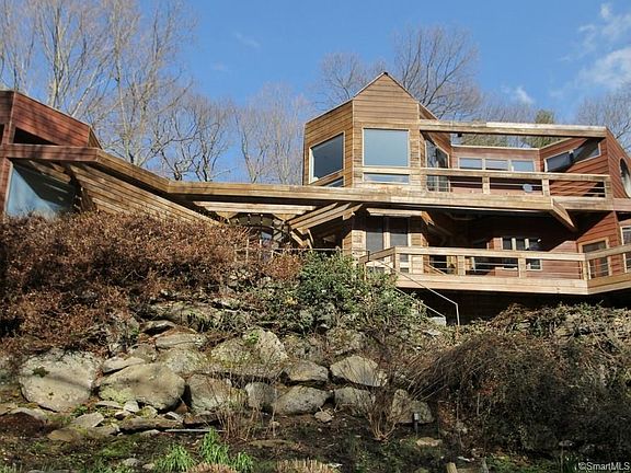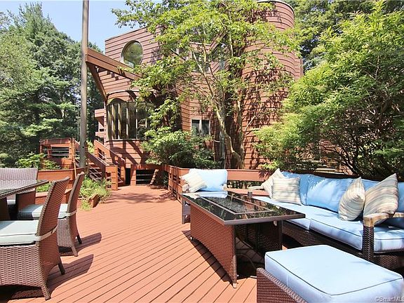 Artistry on the Mianus River Renowned architect Herbert S. Newman, designer of Yale Sterling Law Library & Rockefeller Conference Center Pocantico Hills, created this direct riverfront home using "Frank Lloyd Wright ... settles in New England" as inspiration. The house sits on 2.68-very pvt Westover acres w stone walls, Har Tru court, MBR balcony & freshly painted decks. Embraced by woodlands & gardens, the house is a true retreat from the world, and enjoys splendid views, sounds & direct access to the river. The extraordinary interior, a clear affirmation of form and function, features wonderful use of red oak, stone & glass w exceptional ceilings, hallways & sightlines, significant detailing & built-ins PLUS interesting windows, gabled skylts & glass doors that invite sunlight in & inspire interaction w its natural setting. Entry foyer introduces brilliant design w glass cathedral ceiling; LR has unique high ceiling+stone fpl, DR has tray ceiling+built-ins & both rms have lg windows, water vus+doors to the outside. Roomy EIK has bow window dining area that opens to tiered deck & step-down family rm has stone fpl, beams, stunning ceiling, windows w dramatic views & door to the grounds. Pvt multi-rm Master Suite is a sanctuary w sunny office/den, handsome bath+pvt balcony viewing the river. BR level has 3-sunny BRs, add'l rm for office or BR, 1.5-new baths+doors to patio. Words do not adequately describe what awaits; feature sheet+pictures tell more - a visit seals the deal