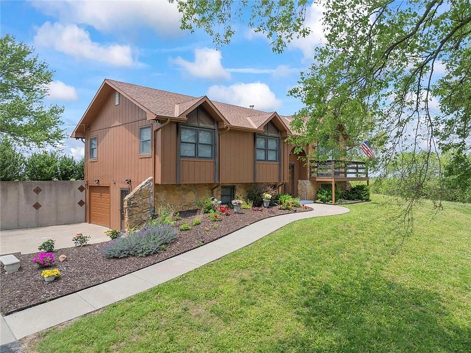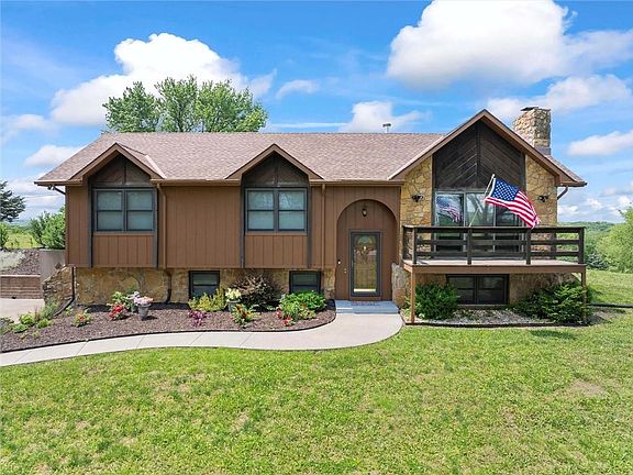 Set on a high elevation with panoramic views of the surrounding countryside, the homesite showcases breathtaking sunrises and sunsets from two expansive decks. On a clear day, enjoy sweeping views of the Topeka skyline rising in the distance. A tree-lined, asphalt driveway leads to a well-cared-for 1974 home featuring 3 bedrooms, 3 bathrooms, a finished basement with a non-conforming bedroom and additional living space, plus a one-car attached garage.