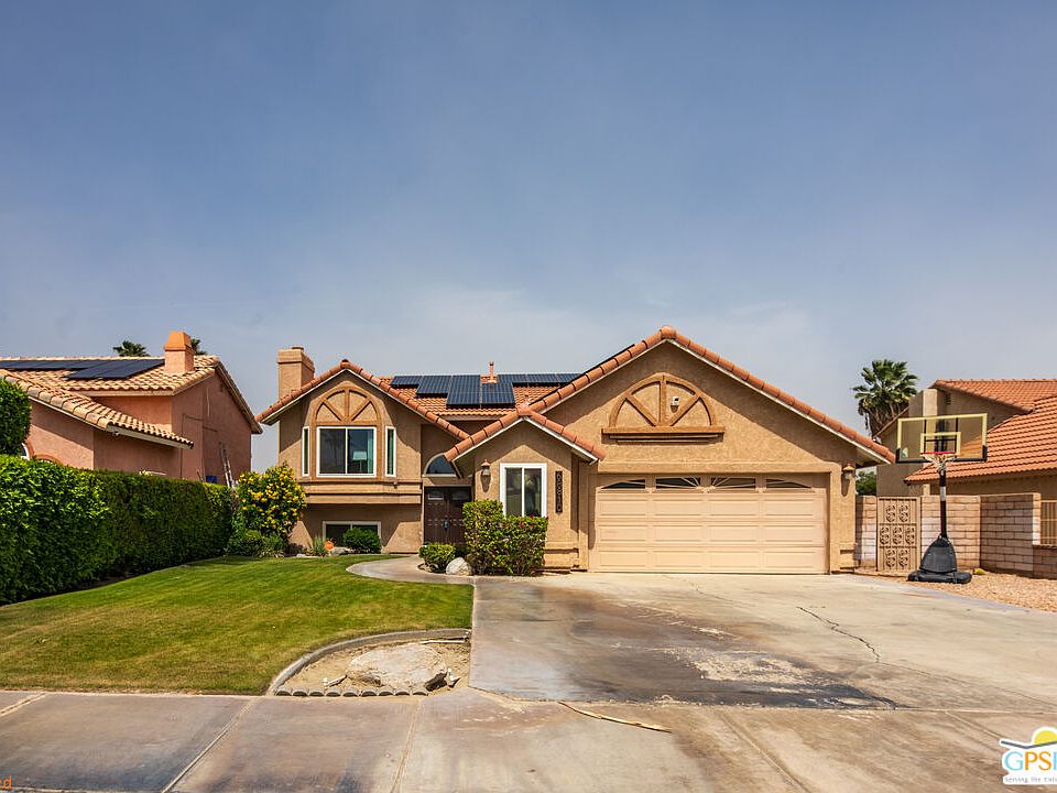 Located in the highly desirable Panorama area of Cathedral City just blocks from Panorama Park you'll find this large 2-story home which features 4 bedrooms, 3 bathrooms plus a large multi-functional bonus room that can be used as a family gathering area, office or 5th bedroom. Newly painted interior, recently installed water heater, AC compressor and pool pump are part of this refreshed residence. Note new dual pane windows with transferrable lifetime warranty will increase your energy efficiency. This as well as solar panels (leased) saves you $$$ and reduces your carbon footprint. Updated kitchen includes granite counters, rectangular tile flooring with sliding doors to small deck. Outside features a 10,000+ sf lot with pool, open lawn area and multiple citrus trees. Realizing new buyers may want to replace existing carpeting and upgrade pool and concrete decking, sellers may consider a credit in lieu of any repairs. Live on the acclaimed street known as "Candy Cane Lane" during the holiday season. Welcome home!