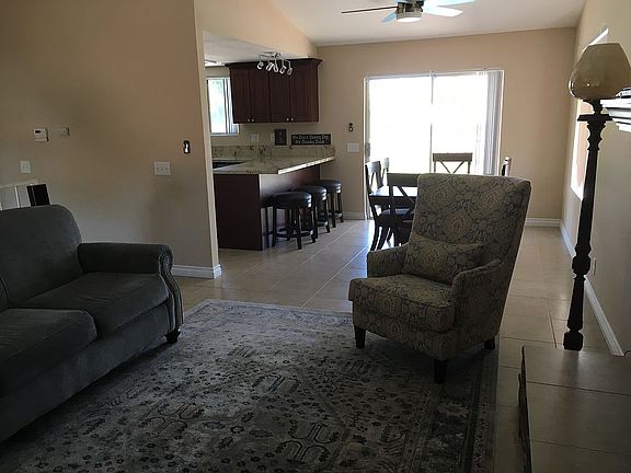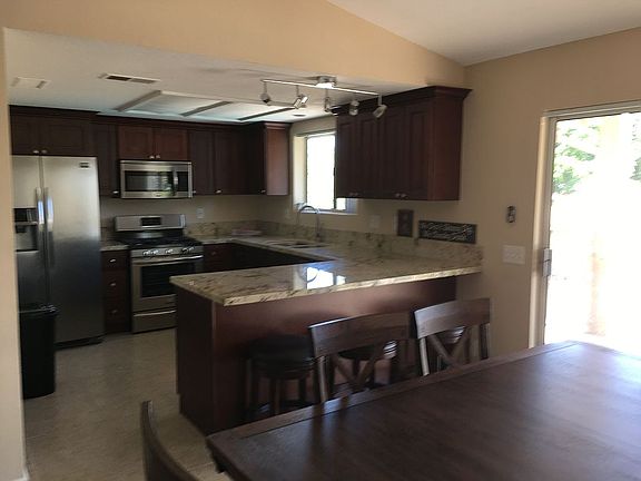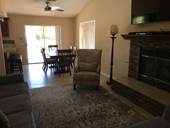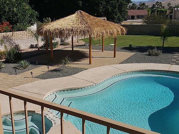 Beautiful split level home in the Palm Springs Panorama neighborhood of Cathedral City, California. Recent renovations include new cabinetry and granite counter tops in Kitchen and Bathrooms, new tile floors throughout and new carpet in bedrooms and game room. New stainless steel appliances, washer, dryer and new neutral two tone paint throughout. Beautiful gas fireplace with custom mantle to conceal electronic connections and 65" Sony HDTV in living room. Beautiful views of mountains as well as custom landscaped front and backyard featuring a commercial outdoor grill, firepit, pool/spa and palapa. This home is the perfect private resort to enjoy a peaceful sunny afternoon or host a family reunion!