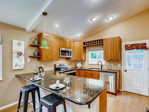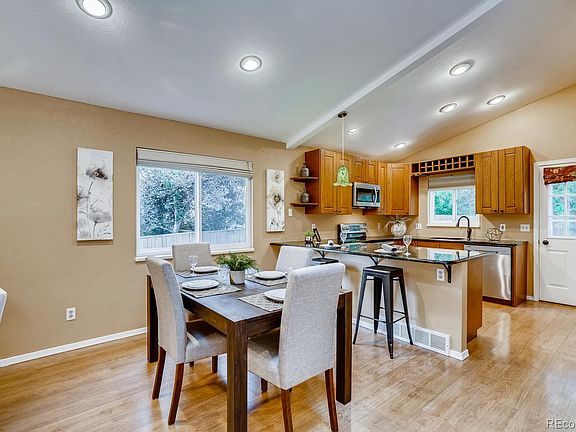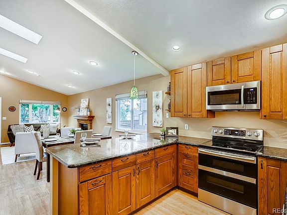 Charming hard to find ranch property in Highlands Ranch! Wide plank laminate floors! Remodeled open kitchen, soft close cabinetry, 2 side pull out pantry cabinets, slab Granite, stainless steel appliances with smooth cooktop & dual ovens, vaulted living and dining room with gas fireplace! Large master bedroom with walk-in closet. Finished basement with large family room/recreation room, Fourth bedroom and 3/4 bath. Great storage! Washer and dryer included. Newer vinyl windows! Wonderful backyard with mature landscaping & large concrete Patio! Walk to Timberline Park! Close to Highland Heritage Regional Park, shopping, Post Office and more. Come take a look-it won't last long!
