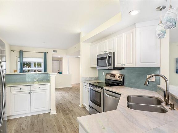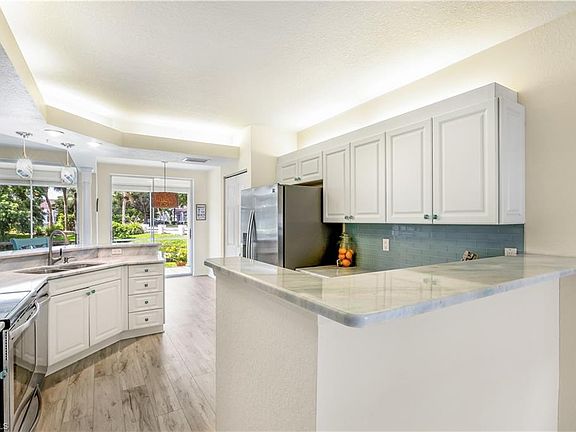 Vanderbilt Beach is just 2.5 miles away! This property is in North Naples in a gated Community of Calusa Bay with a beautiful waterfront view. The unit is on the first floor and has 2 bedrooms, a den, and 2 full bathrooms. The main bedroom features a closet with a professional organizer. There's also an attached garage for your storage needs. The Extra-Large lanai provides a stunning view of the water to the south. The unit has new LVT flooring in 2024, was freshly painted in 2022, and has a new roof from 2019. The bright and sunny floor plan features triple sliders welcoming you to the renovated eat-in kitchen with marble countertops, glass backsplash, and stainless steel appliances. The unit has a newer water heater with a washer and dryer storage area. The unit is also equipped with hurricane shutters. Calusa Bay's amenities have been newly remodeled, including a fitness center, har-tru tennis courts, and 2 pools, one of which is a lap pool. There's also a spacious clubhouse with a kitchen. The community has walking paths and is close to Mercato, Waterside Shops, Restaurants, and downtown Naples. There are also many outdoor activities nearby for your enjoyment!