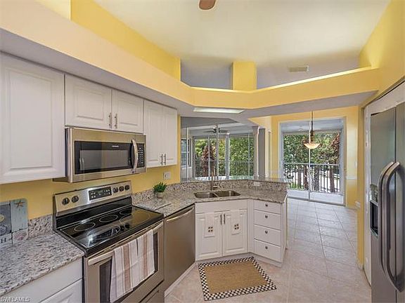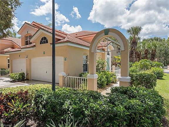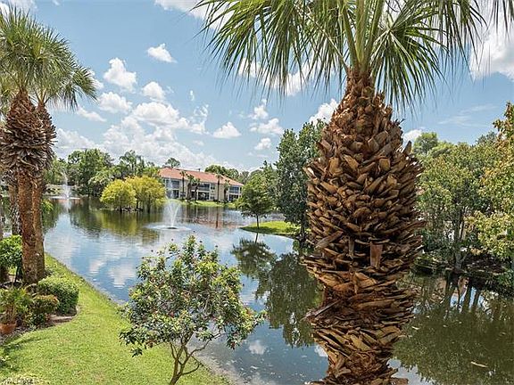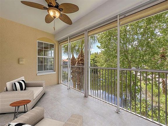 Come see the largest floor plan in Calusa Bay South! With over 2000 square feet, this beautiful end unit 2nd floor condo has it all. So private it feels like a single family home. It features an upgraded kitchen with granite counters and stainless steel appliances, 10' volume ceilings, an oversized two car garage with plenty of storage or room for tools, custom closets, roman tub and walk-in shower in the master bath, flex space in the second bedroom, hurricane shutters, intercom system and more! 3rd bedroom is currently set up as a home office, but can easily be converted back to a bedroom. Enjoy a fantastic lake view, being just steps to the tennis courts, community pool and exercise center. No pets per the HOA rules.