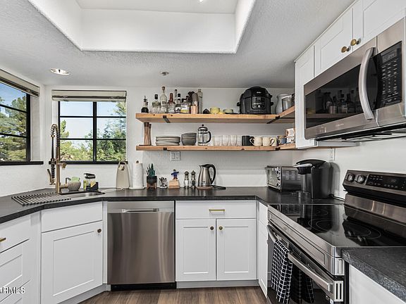 Beautifully remodeled condo located in a prime location. This fully remodeled condo has lots of natural light and features, tasteful LVP flooring, stainless-steel appliances, new bright white cabinets, beautiful open shelving and gorgeous Black Cosmic Leather finish granite. Looking out every window there are mature trees, and you can see the McDowell Mtns from your kitchen window. The patio overlooks a green space and offers a lot of privacy while enjoying the AZ sunsets. The great room has a stunning wood-burning fireplace and a lovely, dedicated dining space. Spacious bedroom has a big walk-in closet, and bathroom has a large countertop with double sinks. A new HVAC was installed during the remodel in 2022. Enjoy the heated pool, spa, BBQ area, clubhouse or workout room in this quiet.. park-like community. This location is known for its numerous restaurants, parks, location to resorts, highly rated schools, location to highways, and of course Scottsdale shopping.