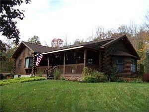 Private location. 5.6 acres of privacy.Large ranch log home w/full basement (finished) Rooms on floor 2 are basement rooms. Many uses, storage, craft room, laundry, rec room w/pellet stove,Full bath down.1408 sf.in basement, too. All appliances stay.Detached 2 car garage(24x24)w/attach workshop(16x24).Bath new 2013,roof 2010,stove 2011.L/R17x25 w/ large bay window & 2 French doors to porches(front & back). Also includes w/dryer,elec. fireplace, cent.vac. freezer, lawn mower & sweeper. Make this home your own and enjoy the quiet. Arcade Electric. Horses,chickens ok.