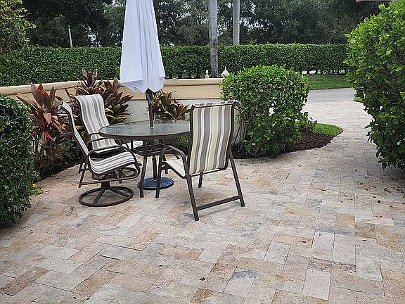NO MORE AGENT CALLS!! One level living at its best. 3 extremely large bedrooms, large dining room, large living room. Double sized kitchen with pantry closets, travertine pavers in front of house on patio and driveway also on the back for a grilling area. There's a huge tiled screened in porch with sliding doors that will withhold up to a hurricane 3 . The porch is tiled with a wet bar. Custom blinds in all rooms and one room has a remote controlled blind. The back is very private and lined with Eureka palms . The community is called Villas Del Mar. There are 2 neighborhood swimming pools both within walking distance from the house. The amount of closet space is unbelievable. HOA Includes lawn maintenance ,pesticide for lawns, 2 swimming pools , cable with HBO and all community grounds maintained.