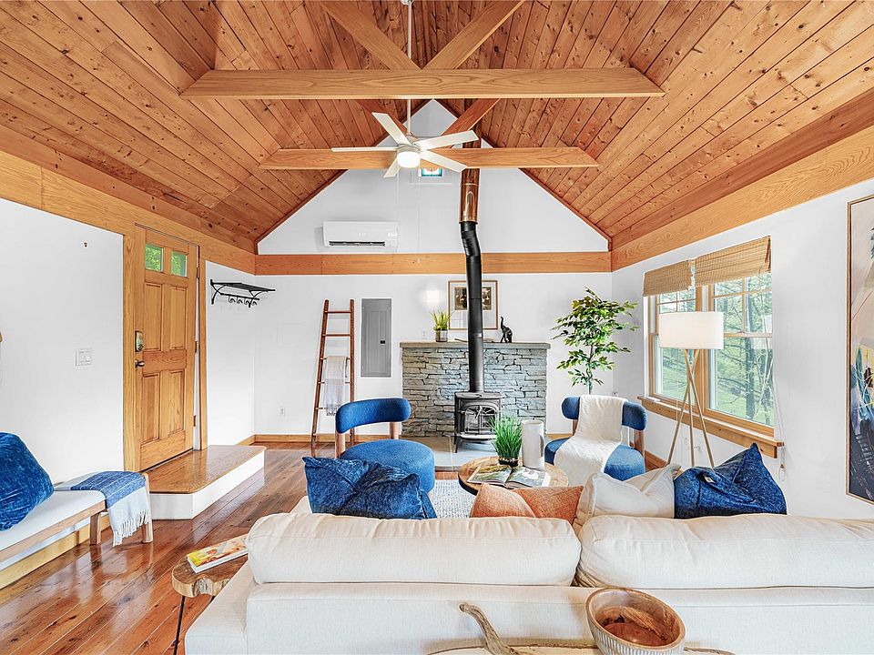 Enjoy the open-concept living space with vaulted ceilings, exposed beams, and original hardwood floors. Abundant windows frame panoramic river views, while a wood-burning stove adds warmth and ambiance on cozy winter nights. For year-round comfort, newly installed ductless mini-splits provide efficient heating and cooling. The thoughtfully designed layout of the main house includes two comfortable bedrooms and a full bathroom with in-unit laundry. Step outside the kitchen onto a spacious, recently built bluestone patio, inviting you to dine al fresco while overlooking the expansive yard leading to the river. The outdoor space offers three patios for relaxing and entertaining, a wide lawn with a fire pit, and a shed to store tools.